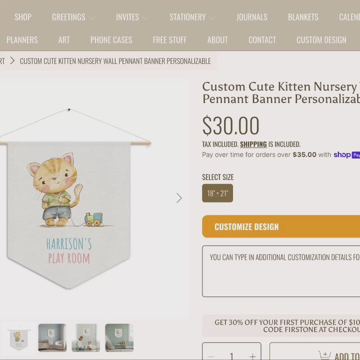 Soft, whimsical, and made to warm a little corner of the home — this pennant brings a gentle, hand-painted kitten and a tiny wooden train into a child’s playroom. The muted watercolor palette and delicate brush strokes create a calm, cozy mood that settles into nurseries and play spaces. Hung from its wooden dowel and twine, the pennant reads like a quiet invitation to imaginative afternoons and storytime. The durable poly twill keeps the colors bright while the laser-cut edges hold a crisp shape, so it looks fresh day after day. Whether tucked above a shelf or over a reading nook, this banner adds a personal, handmade feel to a child’s room.